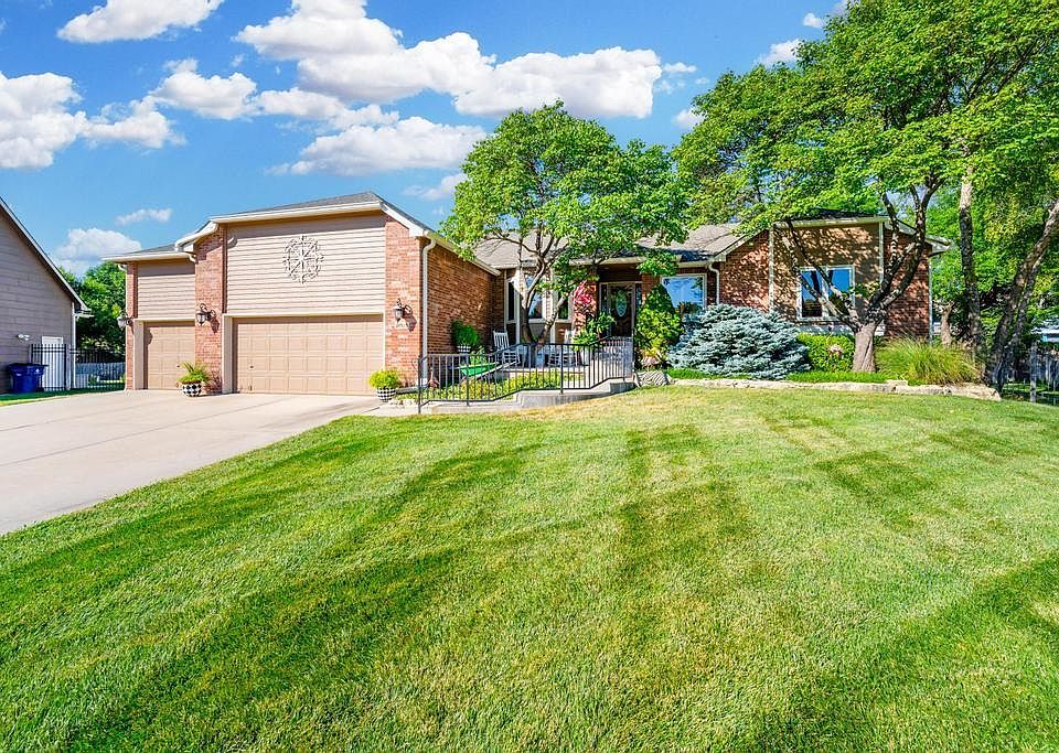 Fantastic home on half acre lot situated in a quiet cul-de-sac. At the entry, notice a new handrail along with a new front deck, great for morning coffee or an evening break. Hard to find, this is a tastefully updated and well-maintained home in the Andover School District. 4BR/3.5BA, 3-car garage, large rooms, high ceilings and plenty of elbow room. Perfect for entertaining, the hub-of-the-home is the 24x26 kitchen/hearth room with eating bar and room for breakfast table if desired. Granite was replaced in 2018 along with adding new backsplash and appliances. Recently, pull-out drawers were added to most of the cabinetry. The room is spacious, also featuring a desk and built-in bookcase. An expanse of windows overlooks the large tree-lined backyard and slider leads out to the deck and recently built pergola that both have lighting and Bluetooth. Doggy door conveys. Wood floors in kitchen were replaced and wood floors were added to living and dining rooms. 3-inch shutters have been added to every window and all but three windows have been replaced. All three fireplace fronts have been updated throughout the house. Formal living and dining room with bay window add to the functionality of this great home. Primary bedroom is quite large, offers a cozy corner fireplace and it also has a door leading to the deck. All three of the home’s full bathrooms have updated countertops, shower doors and flooring and the master’s renovation are exceptionally nice. A free-standing tub and a walk-in shower are terrific updates along with new flooring and granite countertops on the two sinks. View-out/Walk-out basement has new carpet, new full stone wall backdrop for the TV setup and there’s also a full wall of bookcases. Wet bar has new granite counters and new tile flooring. What a wonderful gathering space downstairs, too! Basement also has two bedrooms tucked in back with their full bath. Storage is plentiful and that room also includes a worktable and peg board for tools. Basement refrigerator will convey. Basement carpet was cleaned in June 2022. All duct system was cleaned in 2022 as routine maintenance. Andover Schools, Sedgwick County taxes, low HOA dues, neighborhood pool and playground just steps away – this is a fantastic location! Call today for a private showing!