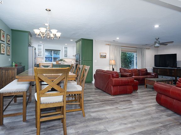So many possibilities with this charming river front home! Over 2,500 sqft of living space under one roof, currently configured as a lovely primary home with beautiful new kitchen and two separate 1 bed, 1 bath guest suites complete with their own kitchens, separate entrances and cozy living spaces. The river suite has a classic midcentury style with lots of windows and a wood burning fireplace. Updated bathroom with walk-in shower and windows in the bedroom that ensure you don't miss the sunrise. There are beautiful river views from the covered patio and deck. The tool shed houses the pump for river irrigation and the yard is so lovely and in bloom right now. Proximity to town, I-5 and the fairgrounds make this an interesting prospect for a vacation rental(s) or just a lovely home with great accommodations for in-laws or extended family.