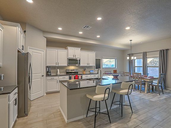 One year young, this 2,025 sq ft single-level home blends modern comfort with functional design. Featuring 3 bedrooms & 2.5 baths, the open-concept floorplan offers a spacious eat-in kitchen w/ island, breakfast bar, pantry, abundant cabinetry, granite countertops & stainless appliances. The owner's suite includes a large walk-in closet, dual sinks, soaking tub & separate shower. The backyard is built for entertaining w/ a fire pit, patio extension & rock landscaping. Additional upgrades include plank tile flooring, ceiling fans, extended driveway, custom garage storage, full gutters, side yard sidewalk, retaining wall and hillside erosion protection--all in a desirable Los Lunas location!