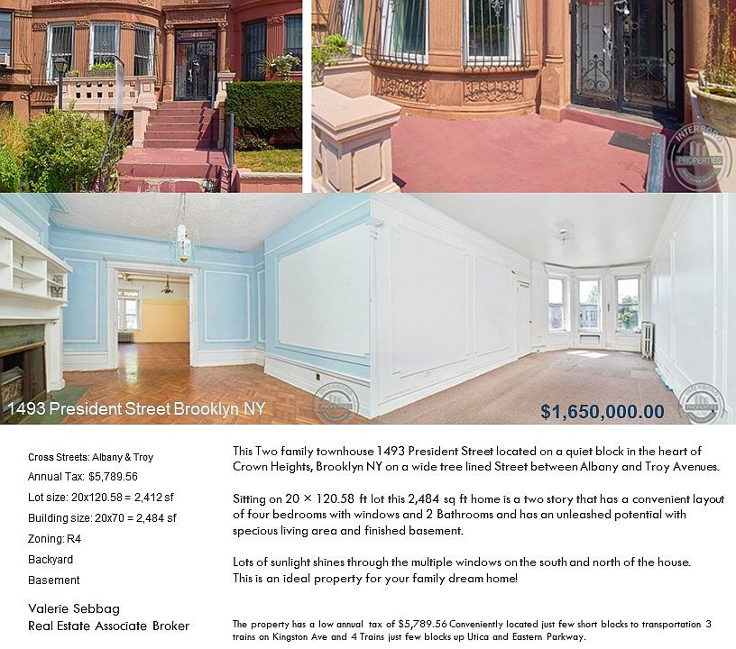 This Two family townhouse 1493 President Street located on a quiet block in the heart of Crown Heights, Brooklyn NY on a wide tree lined Street between Albany and Troy Avenues. 1493 President Street Brooklyn NY 11213 Sitting on 20 × 120.58 ft lot and 50 x 70 ft house this 2,484 sq ft home is a two story that has a convenient layout of four bedrooms with windows and 2 Bathrooms and has an unleashed potential with specious living area and finished basement. Lots of sunlight shines through the multiple windows on the south and north of the house. This is an ideal property for your family dream home! The property has a low annual tax of $5,789.56 Conveniently located just few short blocks to transportation 3 trains on Kingston Ave and 4 Trains just few blocks up Utica and Eastern Parkway. Come explore the Crown Heights neighborhood's vast array of restaurants, upscale boutiques and exciting nightlife scattered throughout this exiting and historic section of Brooklyn. Some notable favorite restaurants. Notable establishments are just two blocks away from 1493 President Street is the world headquarters 770 Eastern Parkway and right across the street you'll find the Jewish Children Museum. Multiple Citi bike locations walking distance from this beautiful townhouse, Nearby shopping on Kingston Avenue and Walking distance from the Prospect Park, Botanical Garden, Grand Army Plaza, The Brooklyn Museum, The Barclays Center and much more. Call Valerie Sebbag today to tour this townhouse.