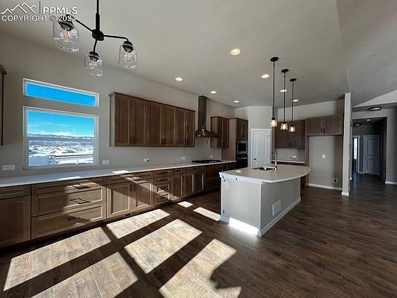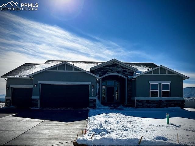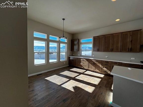 Ashton ranch plan in Monument Junction East. 5 bedrooms, main level study, 4 bath, 3 car garage home. Gourmet kitchen layout features knotty alder cabinets in a pecan finish, elegant Bianco Tiza Quartz countertops, pantry, steel appliances including 36" gas cooktop with vent hood. Vaulted ceilings in great room with dramatic fireplace. Walk out from double sliding glass doors in the great room onto covered patio perfect for enjoying Colorado rain or shine. Finished basement features 1' taller walls and hosts large rec room, 3 bedrooms, and 2 baths. Home includes air conditioning and radon mitigation system.