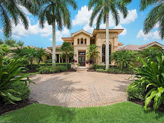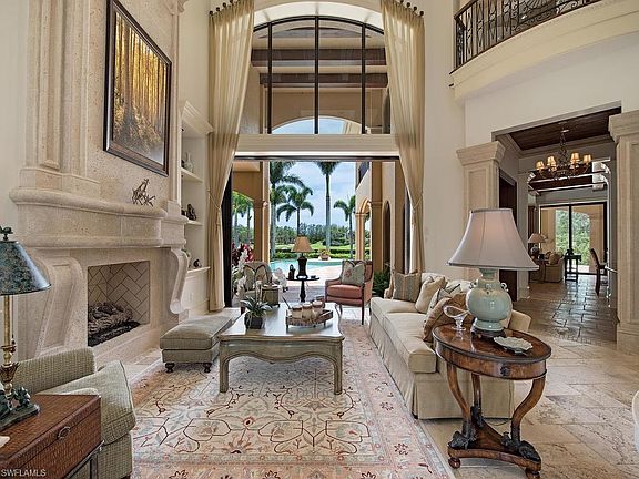 GOLF MEMBERSHIP IMMEDIATELY AVAILABLE! Extraordinary two-story estate built by Harwick Homes combines elegance & luxury creating a sophisticated comfortable ambiance throughout. Instantly captivating designer appointments and architectural features are found throughout including volume ceilings, wide crown moldings, wood beams, coffered & tray design details, a stunning grand staircase, plantation shutters, architectural niches, intricate flooring details, expansive windows, and a well-equipped wet bar, butler's pantry & wine cellar. The crowning touch of this magnificent home is found in the stunning outdoor living spaces. The covered loggia is highlighted by a spectacular gas fireplace, with a delightful summer kitchen with built in grill, granite countertops, refrigerator and work sink. Electric roll down screens provide delightful opportunities to utilize the outdoor space year-round. The expansive lanai features a stunning stone tile pattern accenting the multiple covered & open air sitting areas surrounding the sparkling infinity edge pool and spill over spa. Remarkable outdoor living invites entertaining opportunities with unparalleled lake & golf course views beyond.
