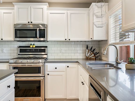 This remodeled home is easy to live in. The updated, light-filled kitchen with island boasts a classic subway tile backsplash, quartz counters, and fancy stainless steel appliances. The island is ideal for food prep and the pantry is essential for storing the staples you need for everyday living. Cozy up to the wood burning fireplace on winter nights and BBQ on the back patio year-round. The spacious primary suite with tray ceilings, walk-in closet, double sink vanity, walk-in shower and private toilet room is an oasis. All bedrooms feature large closets with double doors and the laundry room is upstairs for maximum convenience. New tear-off roof, furnace and A/C in 2024. Rock Creek is a quiet neighborhood yet it is less than 3/4 mile to the Happy Valley Library and just under a mile to Happy Valley Station featuring 20 food carts. Come and tour this house today! We don't expect this gem in Rock Creek to be on the market for long.
