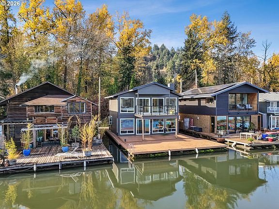 Stunning fully renovated and remodeled floating home in the highly sought-after Bridgeview Moorage on the Multnomah Channel, just minutes from Sauvie Island Bridge and only 15 minutes to the Pearl District and downtown Portland. This beautifully updated residence offers 1,482 sq ft of thoughtfully designed living space with two primary bedrooms, each featuring ensuite bathrooms, large picture windows, and access to the upper deck overlooking the river. An upstairs office provides the perfect place to work or unwind while enjoying sweeping water views. The kitchen has been completely upgraded with brand new cabinetry, modern appliances, and high-end finishes, while all bathrooms feature new tile floors, tiled showers, and stylish vanities. Outdoor living shines with an expansive swim float deck and covered patio, ideal for entertaining, lounging in the sun, or watching wildlife and passing boats. Additional upgrades include a brand new metal roof for long-term durability and the convenience of boat parking right at your front door. Surrounded by natural beauty and the peaceful flow of the Multnomah Channel, this home delivers a true floating lifestyle, and the float has recently been rated a solid 4. Don’t miss this rare opportunity to live in one of the river’s most desirable close-in locations.