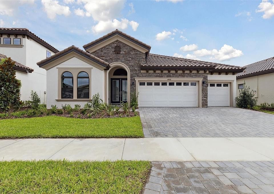 Biscayne I - This Biscayne I is ready for move in! This exceptional home seamlessly blends stylish design with practical, comfortable living. The heart of the home, the gourmet kitchen, features Sonoma Painted Linen cabinets, stunning Frost Whte MSI Quartz countertops, and durable Pride Plus LVP flooring, all flowing into the combined grand room and casual dining area. Soaring 12 foot ceilings in the foyer, grand room, and kitchen enhance this open concept, creating an expansive, airy feel perfect for entertaining. For ultimate relaxation, the private owner's retreat is a true sanctuary, complete with two large walk in closets and a luxurious en suite bath with a garden tub and a separate walk in shower. The smart, versatile layout offers vibrant open spaces alongside tucked away secondary bedrooms and a secluded owner's retreat for privacy. Outdoor living is a breeze with the large covered lanai, directly accessible from the main living area. This is more than a home; it's the ideal setting for your Florida lifestyle. Listing Price amount for this Pending Sale includes Design and Structural Options.