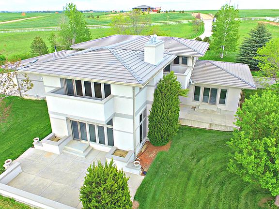 Unparalleled westerly views of Longs Peak from this elegant custom built home on 35 acres! Dedicated open space preserves the fabulous vista. Beautiful Frank Lloyd Wright-inspired interior welcomes you to multi-level living with huge main level Master suite! Large pole barn is recently built to accommodate your horses or other hobbies. Indoor arena possible. No Conservation Easement!