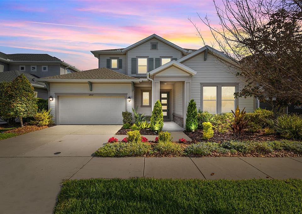 One or more photo(s) has been virtually staged. Discover the tranquility of conservation living in this spacious David Weekley Mendocino home, a well-loved floorplan located in the Asturia community. This home is a perfect blend of modern amenities and natural beauty with 4 bedrooms, 3.5 bathrooms, an office/flex space downstairs, a loft upstairs, and a climate-controlled storage area. Upon entering, you are welcomed by a full bedroom with an adjoining bathroom, ideal for guests or multi-generational living. Down the hallway, you'll find an office space framed with elegant tray ceilings and inviting French doors—a perfect enclave for productivity. The 2-car garage features a tandem space for extra storage or a third vehicle. Beyond lies the heart of the home—a chef's kitchen with a wall oven, pristine quartz countertops, an expansive island with an integrated sink, stainless steel appliances, and a gas cooktop for gourmet creations. The dining room's open design extends to the second story, adding a touch of sophistication, complemented by a built-in desk/study nook. The living room offers a picturesque backdrop of the lush conservation area through a wall of sliders, inviting the outdoors inside. Step outside to a fully screened outdoor sanctuary that promises peaceful relaxation on the covered lanai. Secluded for privacy, the primary bedroom features tray ceilings and conservation views. Luxuriate in the primary bath with a garden tub, shower, double quartz vanities, and a large walk-in closet. Upstairs, the loft provides a flexible space between two additional bedrooms. A full bathroom with double sinks and a tub/shower combo caters to both rooms, and the climate-controlled storage adds practical comfort to the upper level. Experience elegant living harmonized with nature in a home where every detail caters to a relaxed yet refined lifestyle. Located in the sought- after Asturia community with many amenities including a clubhouse, resort style pool, state of the art fitness center, dog park, playground and walking trails. Enjoy events throughout the year planned by the social committee like food trucks, Easter egg hunt, 4th of July fireworks, end of school party, golf tournament, toddler time and more.