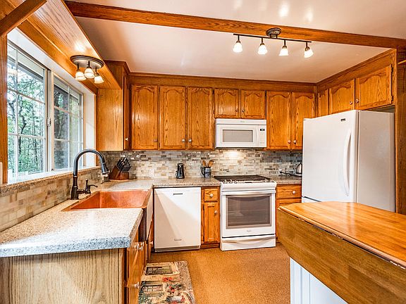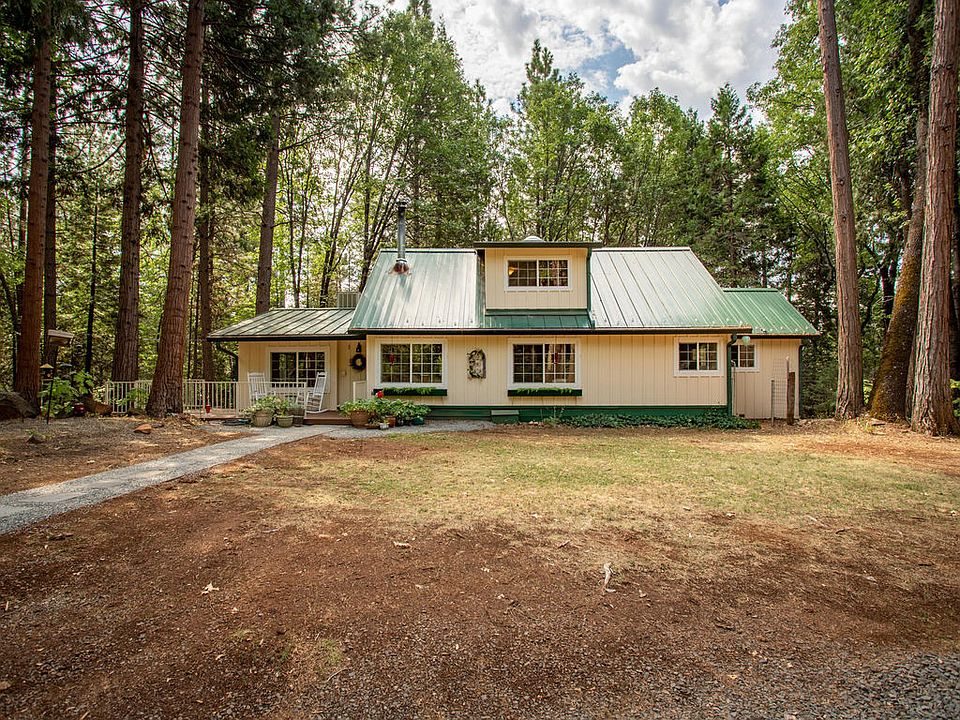 BEAUTIFUL & UNIQUE home surrounded by tall oak, cedar & pine trees. Enjoy the birds & fresh forest air from multiple decks. Open bright floor plan, spacious rooms, Mini Split Heat/Cooling, Artist Loft, Farm style Copper sink, Granite formation counters. Unfinished guest quarters w/Bath, covered carport, RV hookups, horse stalls, hay storage, almost 4 acres of fenced pasture & more minutes to town.