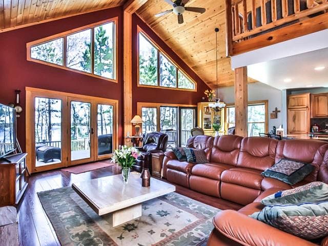 EAGLE LAKE EXECUTIVE - Quality oozes from every room of this home situated on a point of land on Eagle Lake, part of the Eagle River Chain! The chalet style house itself is a beautiful piece of craftsmanship with floor to ceiling windows overlooking the lake, vaulted ceilings, a towering stone fireplace & a kitchen with granite counter tops & stainless steel appliances. The spacious main floor Master Suite also overlooks the water & has a walk in closet & master bath with his & her sinks. The upper level loft area provides additional living/lounge space with 2 bedrooms and a full bathroom. The basement is currently finished and offers 2 bedrooms and a full bathroom and additional area for storage. Built with low maintenance in mind it has cement board siding, DuraLife decking, a black top drive and a permanent pier! Sitting on 1.96 LEVEL green acres with 294' of frontage, this package is rounded out with a 2 car attached garage & 2+ car, 24x36 detached garage.