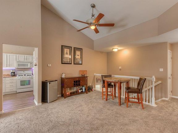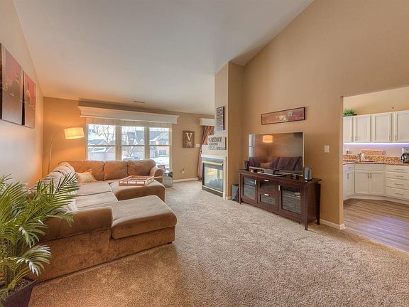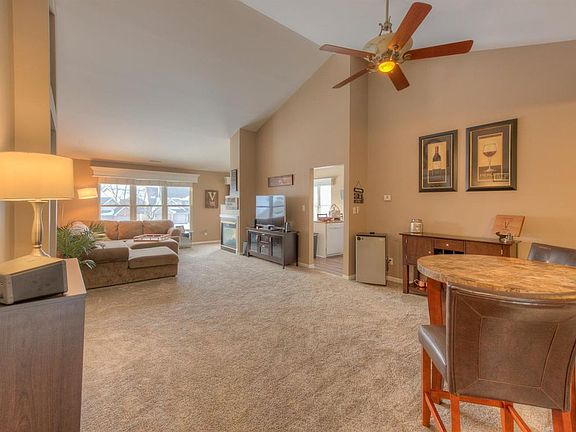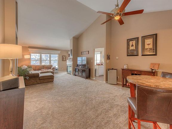 Nicely Updated and Move In Ready. Very warm and inviting and freshly painted with all neutral dcor. This upper unit is situated on corner of cul de sac so it has more windows for more natural light. The Living Room and Dining Room have NEW carpet, vaulted ceilings with views of the 3 sided fireplace (remote Start). The Eat in kitchen has been updated and features an abundance of white cabinets with pull outs, under mount lighting, Granite counters and NEW Floating quick step flooring. TV on wall in kitchen Stays and can be viewed while cooking, eating or sitting on your deck off kitchen. Don't forget to Check out the beautiful Wood Valances,Wood blinds and updated fans & fixtures throughout. The Large Master Bedroom has an enormous Walk-in Closet an upgraded Master Bath with 2 sinks and whirlpool tub. Second bedroom is spacious and has another Full Bathroom next to it. Garage has WIFI garage door opener. Security System. Meticulously kept home. Check out Pond and Walking Trail.