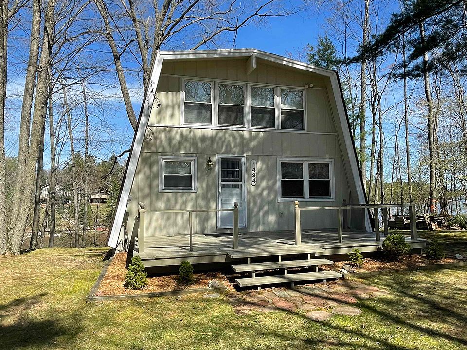Nice chalet style waterfront home, knotty pine interior, four bedrooms, one and a half baths, newer roof and windows, full walk out basement . The cabin is being sold furnished. Relax on the deck with the view of the water or on the deck facing the road. Features include wood burning fireplace, natural gas and boat dock . Enjoy to 330 acre lake, clubhouse, beach, campground and on going activities offered to the member .