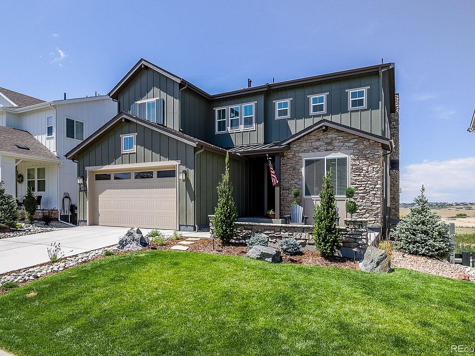 Spectacular views of the front range and open space greet you in nearly every room of this well-appointed home. As you enter you'll be struck by the natural light which comes into the home through large, well placed windows. The dining room opens to the loft above and highlights the vaulted ceiling. The living room, dining room, and kitchen are all connected and move seamlessly towards the upstairs outdoor patio, on which you'll be able to enjoy those views. The kitchen itself features quartz counters, modern light fixtures, crown molding cabinetry, and a walk in pantry. Upstairs you'll find a welcoming and large primary suite with those same mountain views, five piece bathroom, and large walk-in closet. The two upstairs secondary bedrooms share access to a Jack and Jill bathroom The upstairs loft is a wonderful additional space for a library, living room, or music room. Downstairs you'll find a walk-out basement with beautiful new landscaping, concrete patio, and plants. The basement itself has been completed with a large bedroom, gym, and play room. You'll notice the attention to detail throughout the home; whether you're looking at the modern light fixtures, custom professional gym, finished basement, exterior space, etc. The neighborhood itself is wonderful and features a community pool, trails throughout, multiple exchanges, commercial space currently under construction, and just a quick drive from Hess Reservoir. Come take a look at this home today!