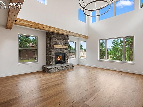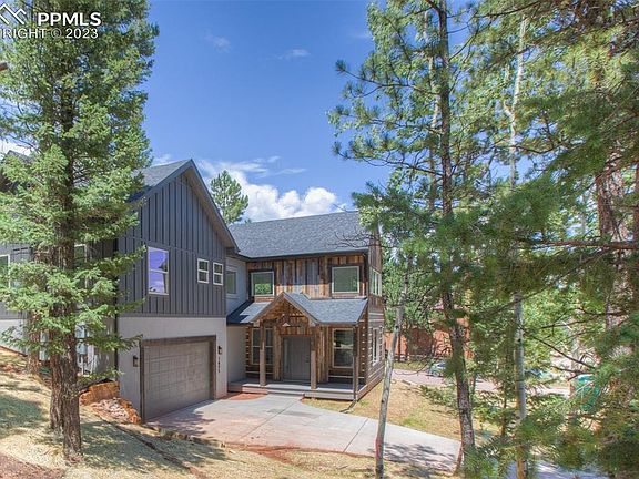 Gorgeous new construction home in Woodland Park! This design is the first of its kind in town on a welcoming corner lot. The courtyard orientation and exterior design provides superb curb appeal in a truly desirable mountain craftsman theme. Upon entry you will notice the soaring ceilings of the great room with two levels of windows looking out toward Rampart Range. The windows bring in abundant natural light, which compliments the coziness of the living room with a stone veneer and distressed wood mantel gas fireplace for a wonderful homey feeling. The entire main floor space is ideal for living and entertaining with an open flow from the living/dining areas to the large kitchen with island, ample cabinetry, stone countertops and separate beverage station or built in desk space. Walk out to the side patio for easily accessible outdoor space. Having a main floor bathroom with shower and separate laundry area brings a great functional finish to the main floor layout. Upstairs is a treat- a luxurious owner's retreat with an ensuite bathroom featuring double vanities, a freestanding tub, curbless walk in shower, and walk in closet. Two additional bedrooms and another bathroom with a shower is also upstairs along with an additional loft space and separate family room. The modern rustic features of the home are unforgettable- with decorative beams, barn wood accents, and an open railing. The color palette is a grey interior with light grey cabinetry throughout. Quartz or granite countertops. Efficiency features include a tankless on-demand water heater. Don't miss this new Woodland Park gem!
