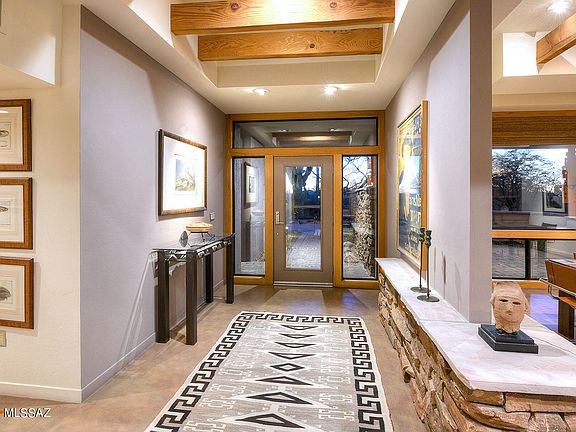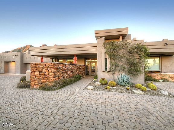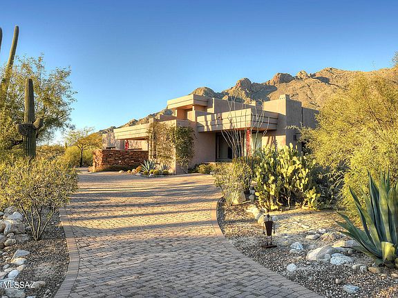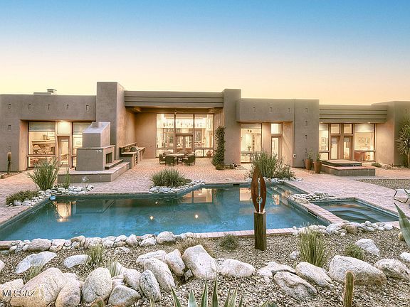 Stunning David Tyson southwestern contemporary on lush and private 1.8 acre cul-de-sac lot in the prestigious upper gated communities of Pima Canyon Estates. Long and winding paver driveway leads into great room of this 4 bedroom, 4 bath, 3,677 sq. ft. home with burnished concrete floors, soaring beamed ceilings, walls of windows and reach out and touch Pima Canyon and Catalina Mountain views. Split floor plan, stacked stone fireplace in great room, gourmet kitchen with center island, granite counters and stainless steel appliances. Gracious primary suite features stacked stone fireplace, beamed ceiling, generous primary bath with spa tub and oversized walk-in closet. Professionally landscaped rear yard with mountain views offers pool, spa, separate hot tub, outdoor double-sided fireplace and outdoor kitchen. Over-sized 3 car garage will fit a small RV, observation deck for city viewing, high Sonoran desert native landscaping and so much more.