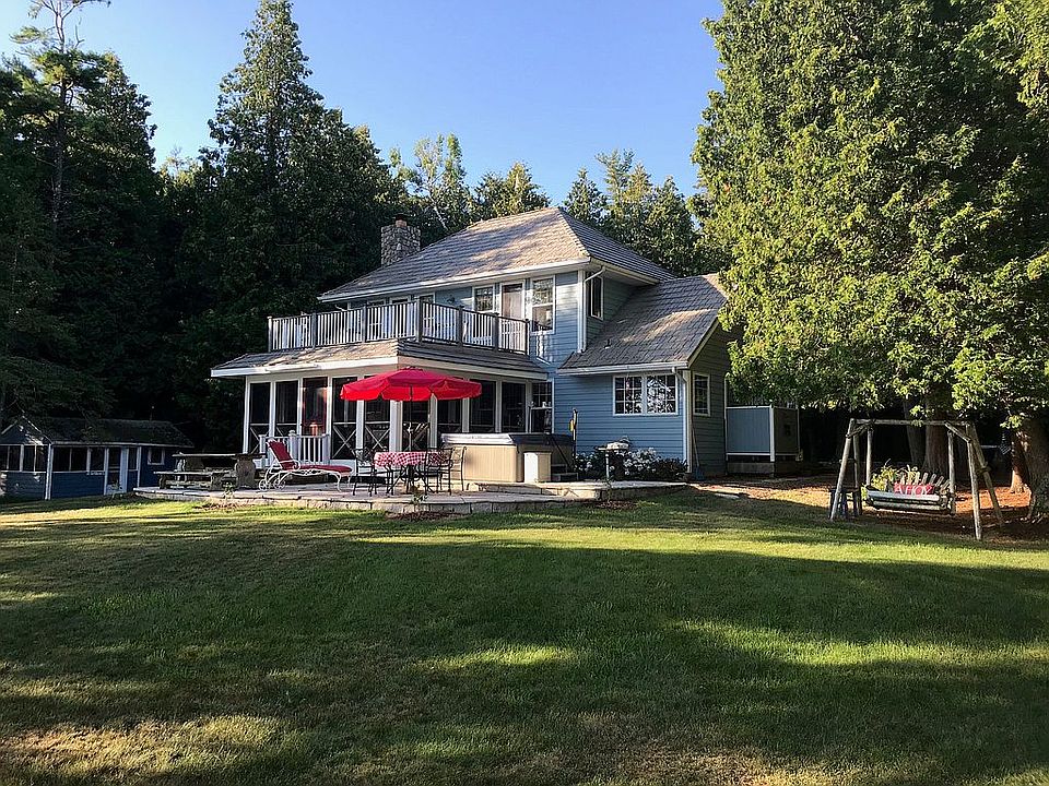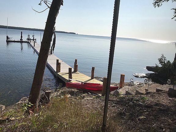 Built in 1992, lakefront two story home with huge 2nd floor balcony over screened porch that opens on to a large patio with hot tub - all overlooking beautiful North Bay. Brand new in 2017, a pile-driven steel framed wood decked 100' long commnercial grade L shaped pier with boat lift. 3 bedroom and 3 baths, stone fireplace and spectacular views. Separate "barn" that can park 2 cars, workbench and plenty of storage on lower level. Upstairs is a carpeted vaulted ceiling loft that's used as a bunk room with a large balcony overlooking the bay.
