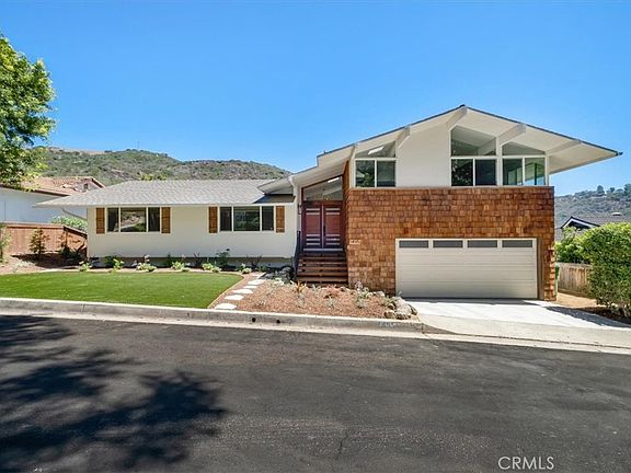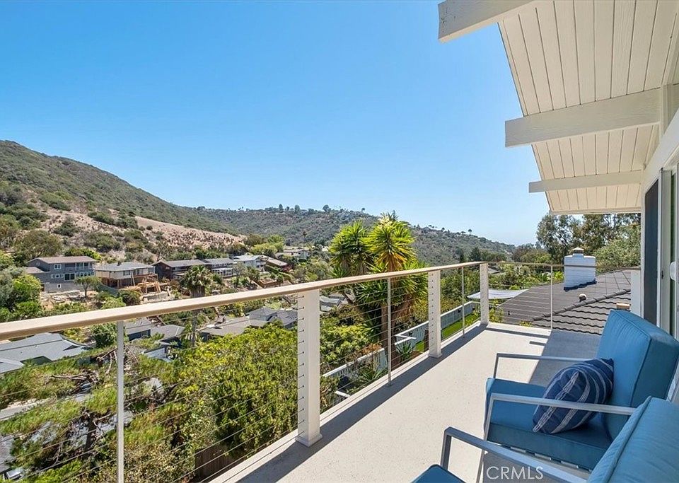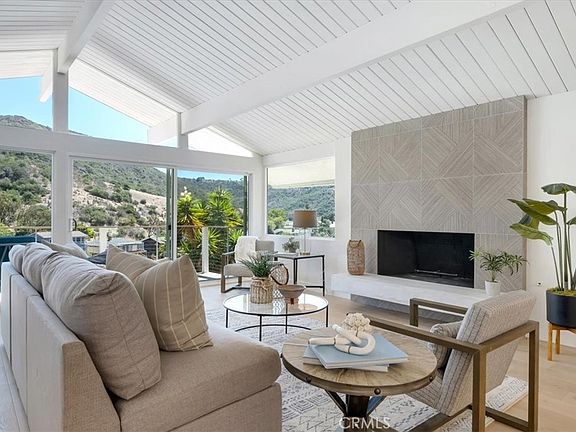 Completely remodeled contemporary Laguna Beach home with stunning views of Bluebird Canyon and peek-a-boo view of the ocean. Stunning wood floors and modern front doors welcome you to a unique tri-level floorplan. Upstairs the soaring tongue and grove beamed ceilings accent the living, dining rooms and kitchen. Custom kitchen offers new white cabinets with soft close drawers and doors, and a six-foot pantry. Elegant gold accents and sparkling backsplash compliment the quartz countertops. Eight-foot center island with waterfall design has additional storage and is great for entertaining. Stainless appliances, gas stove, microwave and refrigerator included. Don’t miss the bottle washer at the kitchen sink. Unobstructed views surround the dining room and kitchen. The open concept boasts a huge living room with a wall of windows showcasing the peaceful canyon, hills, and peek-a-boo ocean view. Step out onto the spacious, newly rebuilt balcony and feel the ocean breeze. Custom fireplace offers a floating hearth and new modern tiles. (There is a plug behind the tile so you can mount a TV.) A custom iron rail leads downstairs to the family room with a second stone fireplace with a marble hearth. The slider opens to a large, brand-new custom deck offering serene canyon views. Recessed lighting under the top deck makes evening entertaining easy. On the main level you have three large bedrooms and two bathrooms plus the adorable laundry room that has a wall of cabinets, custom tile, and a wash sink. The hall bathroom has designer tile around the tub, charcoal floors, a skylight, and a beautiful double sink vanity. The king-sized master bedroom has vaulted wood ceilings and fabulous canyon views. The remodeled spa-like master bathroom has honeycomb marble tile floors, and marble accent walls. Enjoy the beautiful custom vanity with double sinks and the curb less walk-in shower. Walk-in closet and barn doors complete the space. Redesigned front wood porch has iron railing and a new concrete driveway. New landscaping with turf, new plants, a drip system, and steps leading to the backyard. Oversized garage has new epoxy floors. Dual zone central Air conditioning, new windows and updated electrical panel. This home has not been lived in after the remodel! Bluebird Canyon Park is walking distance and world class shopping and dining is a short 5 minute drive. To own this home is to own a piece of paradise.