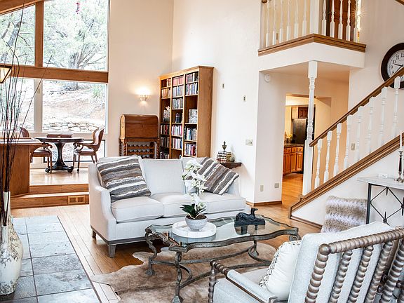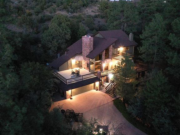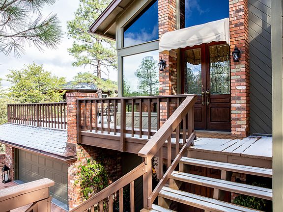 Stunning Mountain House tucked in the pines in the desirable Hidden Valley Ranch. This multi-level home leaves little to be desired, just 5 minutes to town you can enjoy the pines while being conveniently in town. When entering the home, the breathtaking views from the large living space with soaring ceilings, hardwood flooring and floor to ceiling windows will make you fall in love with this home. Enjoy the wet bar and game area as well as beautiful brick fireplace. Off the living area is a large kitchen with a ton of storage. The kitchen boasts an island, bar area, double ovens, and a breakfast nook. Just adjacent to the kitchen is a formal dining room with a window seat and access to one of the many deck areas.