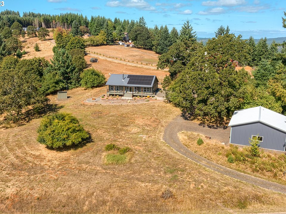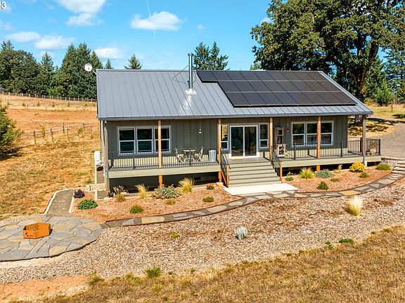 Timeless charm and pristine presentation converge to yield this stunning 27.62 acre property and single-level home. Just 5.5mi outside of downtown Yamhill, the serene, wooded setting paired with sweeping views of the valley forge an intimate setting that mends the balance between rural living and access to nearby conveniences. Built in 2020, the home features 4 bedrooms, 2 full baths, and 1746 sq ft. With a total of 25 solar panels and a home battery backup system, you'll be ready for anything. Worthy of its own magazine cover, the great room inspires awe with its cozy wood stove, impeccable design, and valley views through the slider that can be enjoyed from anywhere in the room, as well as from the sprawling porch that the slider opens onto. Walk down the stairs from the porch and you'll find yourself face-to-face with tasteful, low-hassle landscaping and a fire pit that you and your guests will love. Kitchen with tile backsplash, stainless steel appliances, built-in microwave, dishwasher, propane range, as well as an island with eating bar. The adjacent dining area provides even more space and features a slider that opens to the back patio for when you're ready to take the entertainment outdoors. Spacious primary suite with walk-in closet, ceiling fan, private bathroom, and south-facing windows to soak in more of the views. 3 additional bedrooms round out the main spaces in the home and each features a closet and ceiling fan. Rejuvenate body and mind in the 4-person barrel sauna out back. Quaint garden area with deer fencing - enjoy blueberries, raspberries, strawberries, and wildflowers in this quiet sanctuary surrounded by wildlife. Large detached 36x30 shop/outbuilding/garage with 3 bays. Tons of room to roam, you'll be discovering the charm of this beautiful landscape indefinitely as the seasons change and as you make it your own. Please call for more information and schedule a showing today.