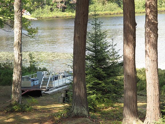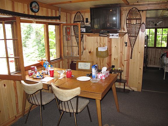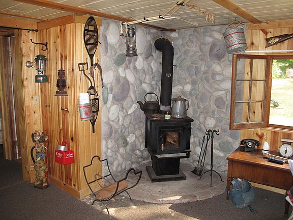 Cedar lapboard cabin with generator shack built atop a hill that overlooks Carpenter Lake and with 92 feet of frontage. Rustic with generator power and gas light backup. Kitchen, living dining are all one room with a cast iron wood stove and all natural stone chimney and wall protection. One bunk room with 1 full and 3 twin beds, and a full bathroom with tub and shower. (Outdoor privy as well). Carpenter lake is a 40 acre lake and residents fish for perch, some bluegill, and pike. There is an old dock on this property that needs repair. Owner including his pontoon in sale.