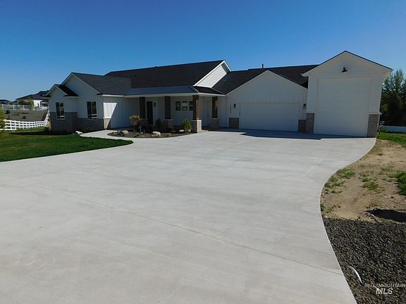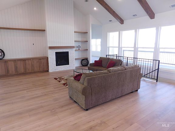 Views, luxury, and quality craftsmanship in a multigenerational home on two acres! Brick accent walls and vaulted ceilings with beams create a welcoming atmosphere perfect for entertaining. Luxurious spa-like master bath offers wall to wall glass and tile with separate vanities. Stunning kitchen features quartz counters, large island with farmhouse sink, breakfast bar, buffet, and cabinet lighting. Walk-through butler's pantry offers convenient storage and food prep space. Enjoy gorgeous views from the covered deck. Huge garage has room for all the toys and includes a 16'x42' RV/boat bay with 14' high door. Easy vehicle access to back of property(on right), with plenty of room for a shop. East facing backyard, animals are allowed. Includes private well, septic, and front landscaping with sprinklers and pressurized irrigation. Downstairs from family room there's a 1900 sf walkout basement perfect for mother in law quarters, etc., framed/roughed in for 3 beds, 2 baths, great room, and storage, furnace included.