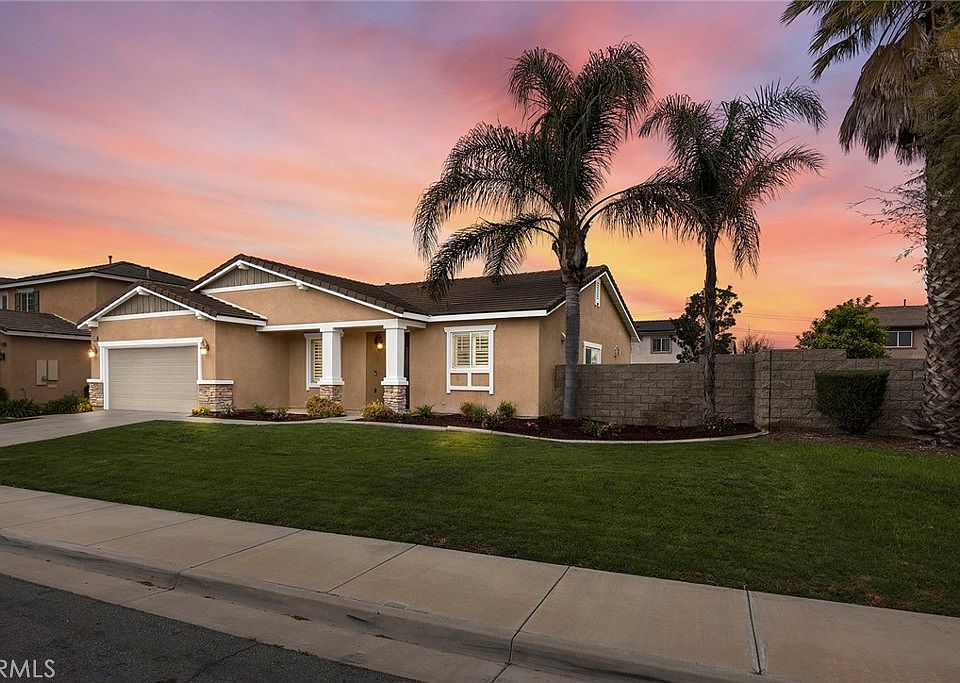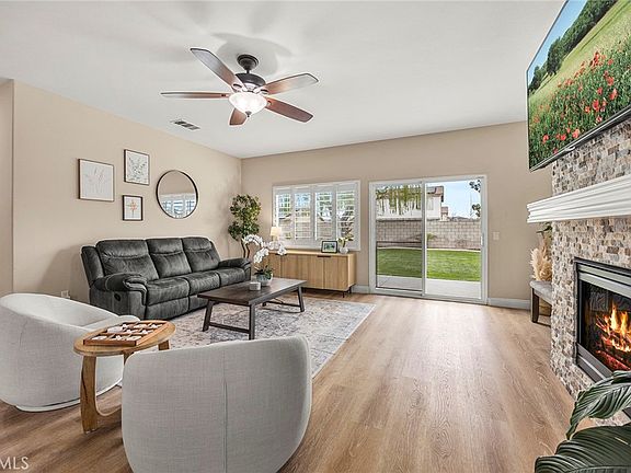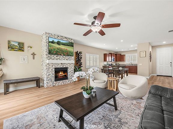 Welcome to this beautiful 3-bedroom, 2-bathroom home in Eastvale, offering 1,631 square feet of light-filled living space on a generous 8,200 square foot lot. From the moment you step inside, you'll love the designer paint, ceiling fans throughout, wood laminate flooring, and open layout that creates an inviting atmosphere. The bright kitchen boasts granite countertops, stainless steel appliances, recessed lighting, pantry, and plenty of cabinet space. It seamlessly flows into the family room with a cozy fireplace, making it the perfect space for gatherings. The spacious primary suite features a walk-in closet, and a luxurious ensuite bathroom complete with a soaking tub, walk-in shower, and dual sinks. Two comfortable secondary bedrooms and full bathroom are perfect for family or guests. Step outside to the expansive backyard, where a beautiful willow tree provides the perfect shady retreat. Enjoy the lush grass area and spacious patio, ideal for entertaining or simply unwinding. Additional features include a two-car direct access garage and indoor laundry room with a sink that adds to the conveniences. This home offers the perfect blend of comfort, style and space and is a prime location for parks, shopping and entertainment. This desirable Eastvale neighborhood is a must see.
