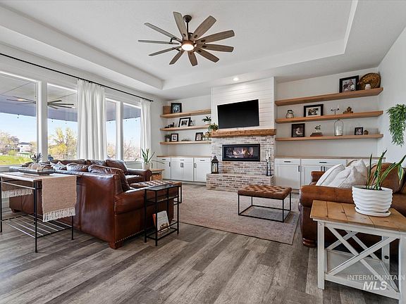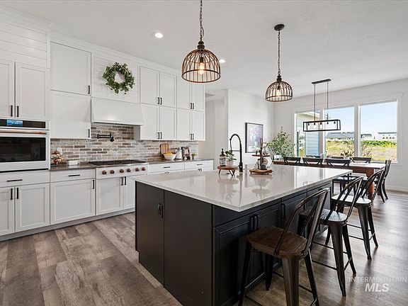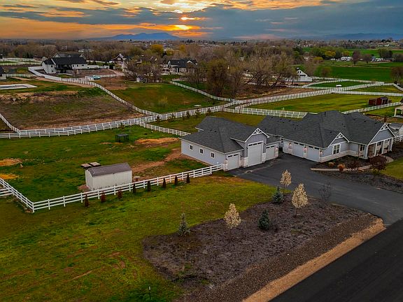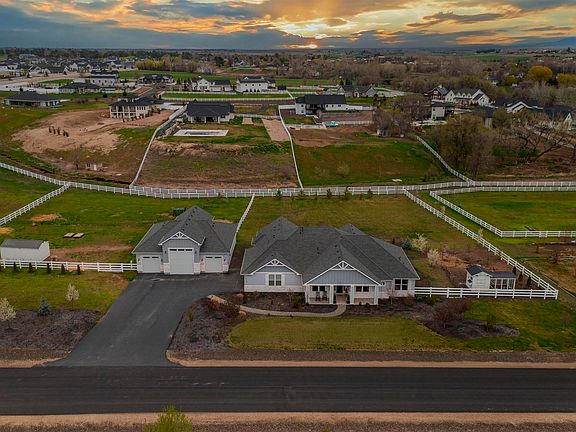 Situated on two fully fenced, flat, usable acres, this luxury estate blends elegance, comfort and rural charm. The split floor plan + an office also offers dual primary suites, while the spacious great room connects the kitchen, dining and living areas for seamless, everyday living. Car enthusiasts will love the 44x44' shop with 11' tall side bays, 16' tall center bay & RV power—plus an oversized attached 2-car garage with finished floors. Inside offers generous storage such as dual pantries, multiple closets, large laundry room, and walk-in closet. Relax on the covered patio with room for dining & epic sunset views of farmlands and the Boise foothills. The property includes a separate, fully fenced pasture area with an 11x20’ barn—perfect for your animals. Minimal HOA, neighborhood irrigation, and a private well. Quick access to I-84, Nampa, Middleton, and Purple Sage Elementary. High-speed fiber internet, great cell service, and peaceful surroundings make this the perfect rural escape with modern comforts!
