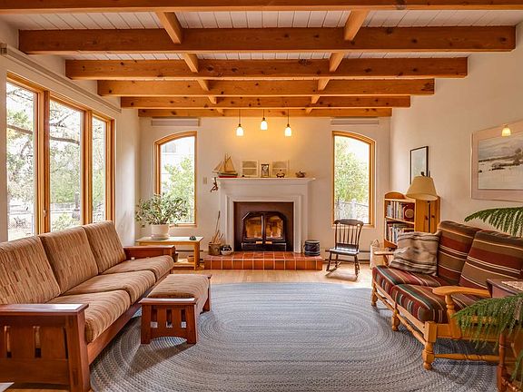 Located in a quiet, serene neighborhood and near to the lab and downtown, this cozy and inviting home offers plenty of space, including 5 bedrooms and 3 full baths. The gorgeous living room with a fireplace and wooden beams above makes for a place where family and friends can gather around to enjoy the company of others. Beautiful hardwood floors throughout and windows with wood trim add consistent warmth and character. Down the hall from the living room, a private guest room with a full bath next to it offers guests a separate area of the house to retreat to. A porch in back just off the dining area makes for a nice area to relax and take in the beautiful and peaceful backyard atmosphere. Back inside, you will find the kitchen to have plenty of cabinet and pantry space along with a gas range. Upstairs, you will find the master bedroom with a dedicated, spacious master bath. Three windows in the master let in plenty of light for a bright, cheerful mood. Across the hall, you will find another large room that can function as a bedroom or an activity room. The large windows in this room also let in lots of light as well. Outside and in front of the home, a sizeable front yard along with a double cover carport on the left-hand side just add to the appeal. Come have a look at this warm and friendly home!