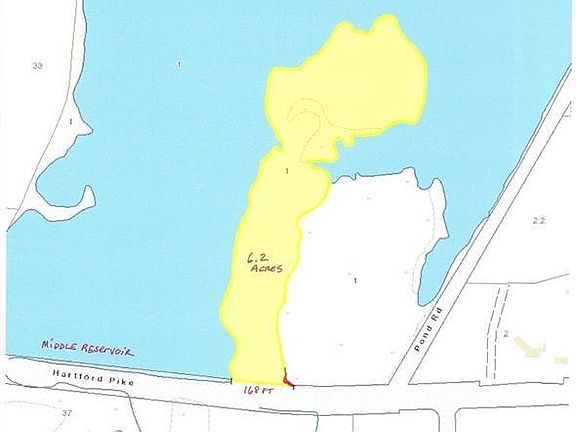 Approx. 175 feet of frontage on Hartford Pike/ Rt 101. Over 6 acres of privacy and seclusion on Middle Reservoir surrounded by water and nature's beauty. .75 miles to RI Line, and accessible to all the conveniences of Killingly Commons. Raw land with no perc test, no survey or any history of testing. Buyer(s and Buyer's agent to do due diligence, property is surrounded by water/wetlands and approx. 195 feet wide. Google Middle Reservoir CT for info about Middle Reservoir and nearby water bodies.