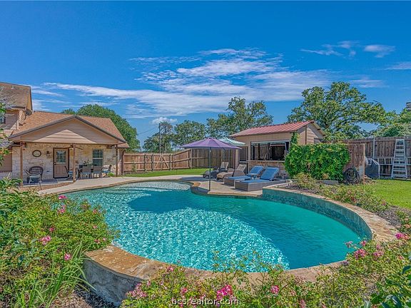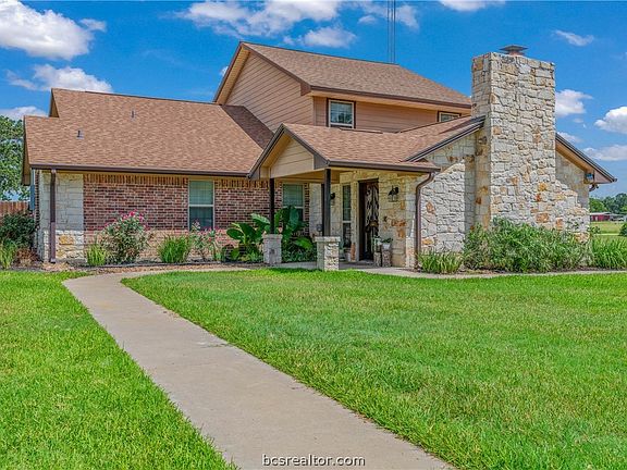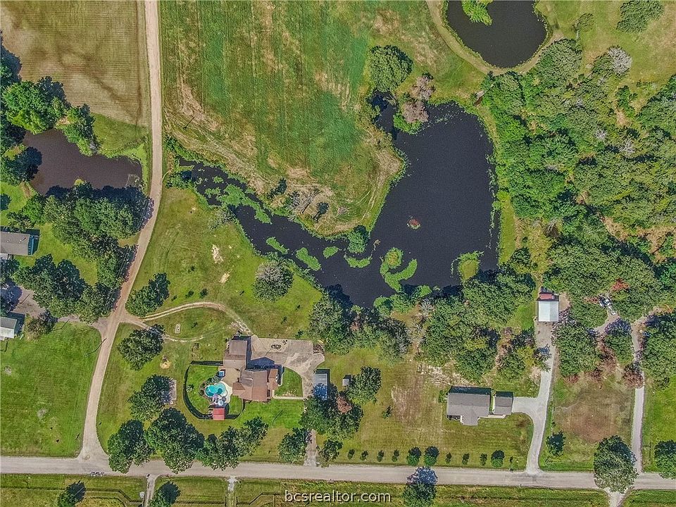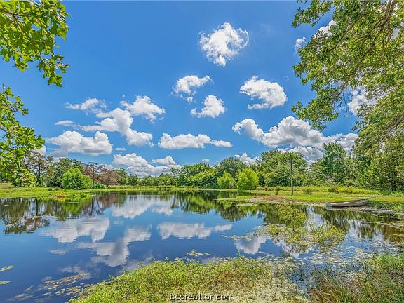 Wake up and drink your coffee each morning looking at the tranquil beauty of nature and the sun rising over the water right outside your large picture window. Just a 25-minute drive from Texas A&M, you can enjoy your favorite campus events. Upon entering, a breathtaking view from the main living area greets you. A floor-to-ceiling fireplace & wooden beams create a cozy ambiance. Large windows offer a panoramic view of the 2-acre pond, making the countryside scene the focal point.The heart of this home is the culinary kitchen, featuring custom cabinets with soft-close hinges, expansive granite countertops, double ovens, an induction cooktop, and a convenient beverage area with a bar sink. Remodeled in 2017 the first floor features the primary bedroom, office, guest room, and bathroom adjoining a walkthrough laundry room near the pool area. Upstairs, the third and fourth bedrooms and additional bathroom offer added privacy. Extra shelving behind sliding barn doors and a walk-in attic make storage a breeze.For RV owners, utility connections ensure convenient adventures. Nature enthusiasts will enjoy the 20-foot-deep pond stocked with bass, catfish, and crappie. The property is a wildlife haven, home to geese, birds, reptiles, and whitetail deer.