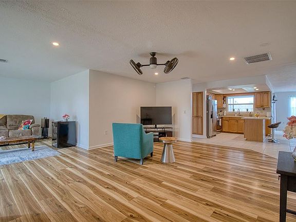 This tres chic 3 bedroom, 2 bath pool home sits gracefully on generous sized lot, NOT A FLOOD ZONE in the desirable Ambleglen neighborhood in delightful Dunedin golf cart area, west of CR 1. Jump into your golf cart and venture downtown for dinner, or one of the many festivals or farmers markets. This beautifully updated home boasts a large living room, formal dining room and family room, 3 generous sized bedrooms, 2 full bathrooms, an outdoor screened Florida room and a delightful kitchen with newer stainless steel appliances, that is open to the family room and dining room. The primary bedroom is split from the other 2 bedrooms and is a bright and spacious retreat that opens to the oversize swimming pool that was resurfaced in 2015. The tastefully renovated primary bathroom is also spacious with quartz countertops, and a generous shower stall and bidet toilet. The huge backyard offers privacy, a large patio for a seamless blend of indoor/outdoor entertainment living, and is fenced for privacy and pool safety. This home is move in ready with tasteful touches such as; neutral color tones (interior and exterior painted 2025), newer fans, modern light fixtures, and laminate and tile floors throughout this impeccably clean and welcoming home. This home also features double hung tilt in windows, newer roof (2018), A/C (2025), water heater (2022). There is plenty of natural light and room to grow in this well laid out open floor plan. Couple this with excellent schools and close to shops, airports, beaches and all that fabulous downtown Dunedin has to offer and you have the perfect Florida lifestyle home.