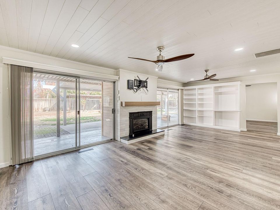 Gorgeously remodeled Northwest Fresno home on a large lot with OWNED SOLAR!!! Kitchen aid refrigerator and wine fridge included!!! Upon entry, you are greeted by the open oversized family room that features an inviting gas fireplace, built-in shelves, and dual backyard sliding doors that allow ample natural light to fill the home! The kitchen features leather-finished granite countertops, a stainless steel farmhouse sink, ample cabinet space, and a pass-through into the dining room, complete with a dry bar & wine refrigerator. There are 3 bedrooms and 2 remodeled bathrooms. The primary bedroom features a walk-in closet, backyard access, and a beautifully remodeled bathroom. Walk out to the oversized backyard that features a large covered patio space that includes light/fan fixtures, and tons of space for gatherings! Enjoy updates to the home such as beautiful laminate flooring, light fixtures, fans, & fresh paint! All within a short distance from excellent schools, restaurants, and shopping centers! These are just a few fantastic features you'll find at this NW gem! Don't miss out, schedule your appointment today!