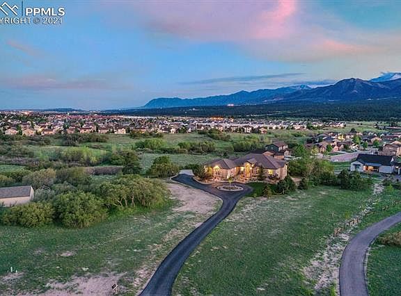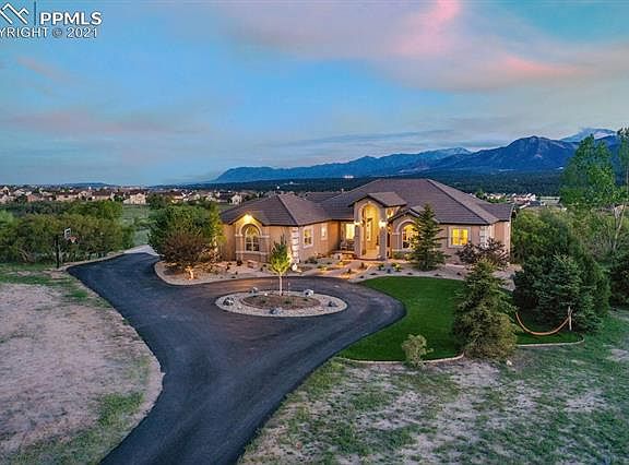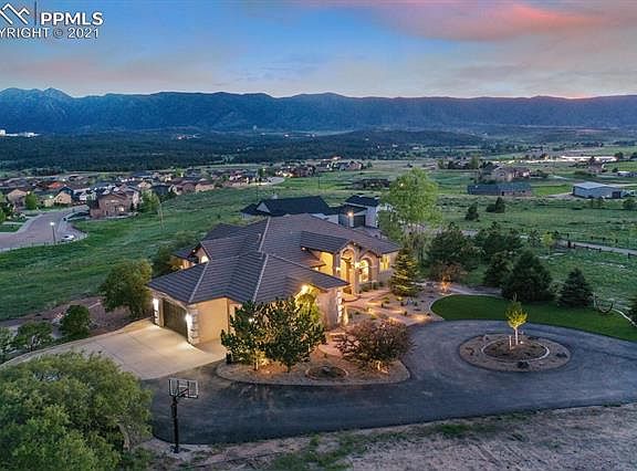 . Fantastic 2.55 acre lot offers panoramic views of the front range and Air Force Academy. This home is an entertainer's dream with absolutely unbeatable indoor and outdoor amenities. The backyard features a massive patio for soaking in the sun and majestic mountains, full sand volleyball court and gas fire-pit perfect for large groups or family hangouts. Don't miss the small scrub oak forest where kids can play and explore. Inside you will find a spacious and open layout featuring breathtaking views from the kitchen, living room and master bedroom. Also on the main level, a large dedicated laundry room, 2 secondary bedrooms (one makes a perfect office) plus a full secondary bath and a half bath. Those able to pry their gaze from the jaw dropping views will be delighted by the modern floor to ceiling stacked stone linear fireplace, custom walnut shelving, updated granite, flooring, light fixtures and more. Walkout to the west-facing composite deck from the main bedroom and informal dining room. In the basement are two large bedrooms with walk-in closets, jack and Jill bath and private vanities. Continuing through the basement, behind a subtle family-room bookcase you will discover the home's own speak-easy complete with full bar and theater room. App controlled landscape and Jellyfish Lighting bring the home to life at night. Experiencing the abundance of privacy as you take in this home and this lot it is easy to forget how close you are to major shopping, restaurants and businesses. Served by Academy D-20 and minutes from I-25, Northgate, Monument, etc. this property checks all the boxes. Oversized heated three car garage has space for extra storage or small shop. Plans for additional detached 4 car garage with RV stall and guest apartment are approved by regional and available for the new owner.