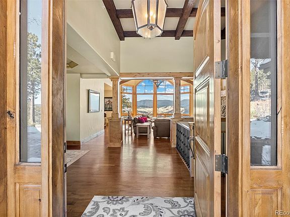 Stunning mountain contemporary home in The Preserve at Pine Meadows. The community consists of 53 5-7 acre parcels connecting to 600 acres of community-owned open space, paved roads, buried utilities, natural gas and Neteo and Starlink internet access. The Preserve is a designated FIREWISE COMMUNITY which includes a 96k gal cistern, int sprinkler systems in all homes, rated bldg materials and an active partnership with the Colorado Forest Service and Elk Creek Fire Dept on forest mgnt. The home itself is designed for luxury main level living but includes a spacious living/entertaining area in the lower walkout level. The entire home was custom designed to face the amazing views. The main level includes a stunning great room, powder bath, large office, luxury primary suite with private deck and five piece bath, an open concept kitchen with seating, large butler area, separate dining room and a huge mud/laundry room with a spacious desk/office area. The lower level includes a spacious family room with a slate/gas fireplace, 4 more bedrooms, a large office, 2 bathrooms (one with steam shower), and a large wet bar with seating. Finishes include large window systems (with electric blinds), mesquite hardwood floors and slate tile. The Great room is vaulted with beams and a floor to ceiling real stone gas/wood fireplace. The kitchen has custom knotty alder cabinetry with granite tops and professional chef appliances. The outdoor space includes a large hard Brazilian cherry deck with a gas fireplace, a private deck off primary bedroom and an expansive patio off the lower walkout. 3 car garage and paved driveway and street appeal galore. The land is gentle and usable. This neighborhood of home values of $1M+ is very active with hiking, traveling and social events. Shopping is only 10 minutes away and you can reach Denver in 30 minutes. Only 90 minutes to ski resorts. And then there are the ...VIEWS, VIEWS, VIEWS!! See more details at 14965wetterhornpeaktrail.com.