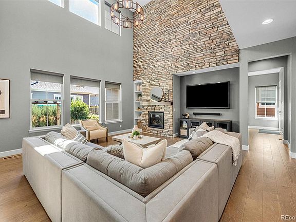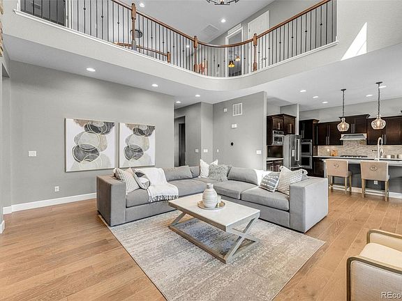 Welcome to your dream home in the vibrant Parker community! This beautiful property offers the perfect blend of luxury living, comfort and entertainment. Stepping through the door you are immediately drawn to the elegant foyer, sweeping staircase and vaulted ceiling in the great room. The gourmet kitchen is a chef's dream, featuring a charming kitchen nook, a generously sized island with exquisite quartz countertops, and high-end stainless steel appliances. The main floor also includes a lovely bedroom with an ensuite bathroom, offering privacy and convenience for guests or multigenerational living. Working from home? You will find an additional office/studio space that's perfect for co-working or pursuing your creative passions. Head upstairs to discover a loft area and two nicely sized bedrooms with walk-in closets that share a beautifully appointed bathroom with dual sinks. A catwalk leads you to the primary bedroom, offering a private retreat with a dual vanity and an incredible walk-in 12' dual shower configuration. An adjacent laundry room adds convenience to your daily routine. The custom finished basement is an entertainer’s paradise! It features a bar for crafting cocktails, a built-in theater, an exercise room with mirrored wall, and gaming area. An additional office/bedroom with a steam shower adds versatility and comfort to the space. This residence is more than just a home; it's a lifestyle. Every detail has been meticulously crafted to provide the utmost in comfort and luxury. The nearby clubhouse in Sierra Ridge offers a playground, pool, and seasonal food trucks. Don’t miss the chance to make this extraordinary property your own!