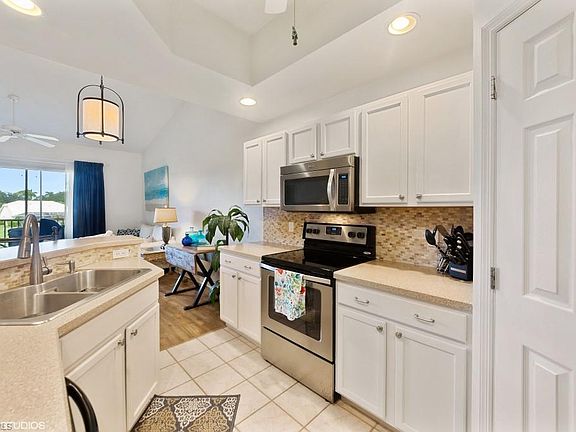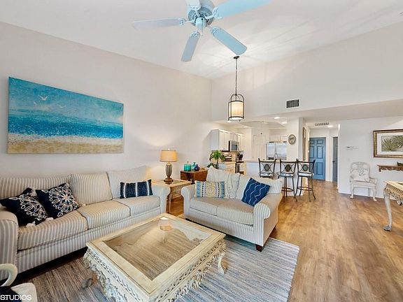 Enjoy the fantastic views and sunsets overlooking hole #7. Turnkey furnished, well maintained and ready to move in. The 3rd bedroom gives you extra room to use as an office, den, or guest bedroom. Luxury vinyl in the main living areas, solid surface counters in the kitchen extended to accommodate bar stools, updated backsplash, stainless appliances, full size stacking washer/dryer, comfort height toilets; new soaking tub in guest bath. Undercover parking and large storage unit. 186 slip deep water Marina with slips available for lease or purchase. Some amenities herein available but not offered. Sq. Ft. approximate or from Lee Co. Master Association Fee: $1,350/Annually, Condo Fee $350 monthly