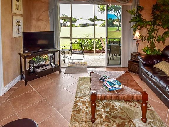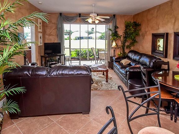 PERFECT RENTAL OR VACATION HIDEAWAY. Located in Gulf Harbour in south Ft. Myers, this first floor 2Br/2Ba condo overlooking the golf course is the perfect investment as a vacation hideaway or a rental property. Close to the beaches; close to shopping; close to the airport, Twins and Red Sox stadiums. Beautiful tile on diagonal thru the living area. Recessed lighting, beveled edge counter tops, wooden cabinets, walk-in pantry, new refrigerator and stove in the galley kitchen, which is open to the living area. Sold turnkey with tasteful comfortable leather furniture. Large screen TV. Lanai is offset from other units so you can enjoy quiet relaxation. Master has walk-in closet, split sinks and golf course view. Guest room has double bed and bunk beds. Guest bath has private dressing room with sink, plus regular bathroom with tub/shower. Covered parking with large storage closet. Two bikes in storage closet included. Just steps to community pool. A short drive inside the gate gets you to the private island where you can enjoy riverside walks and gorgeous sunsets. Some amenities--tennis,golf,restaurant--require Gulf Harbour membership, which are currently priced at bargain levels.
