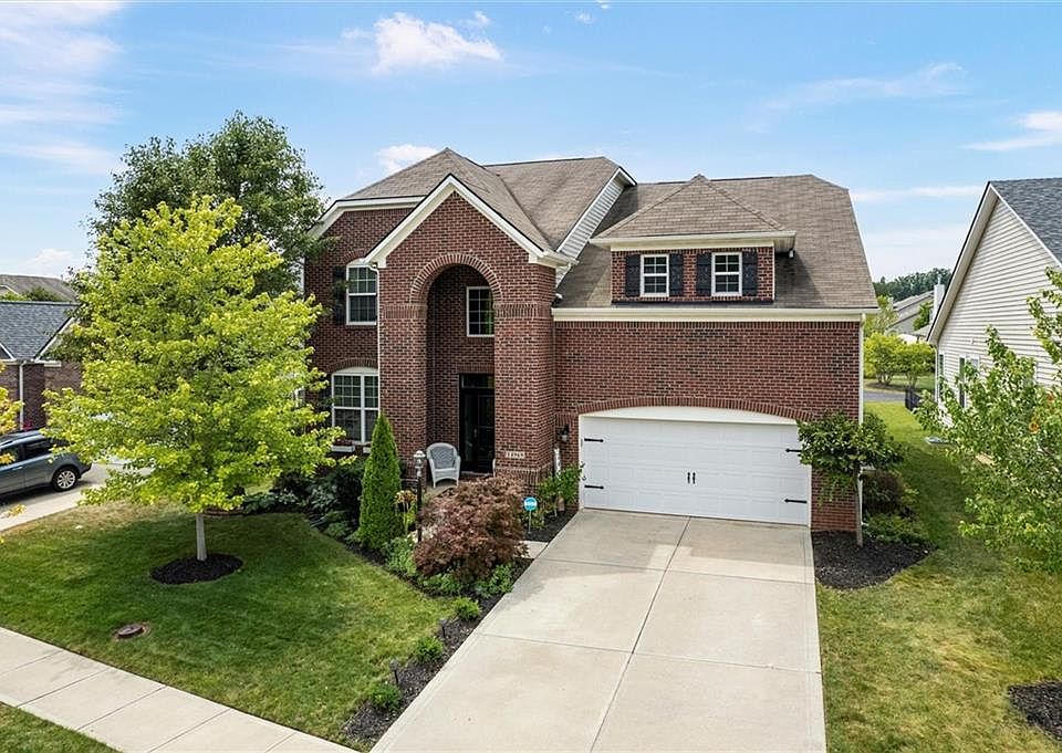 Stunning brick 2-story home in Noblesville close to shopping, walking trails & popular Dillon Park. 4 bedrooms, 2.5 baths, office on main level, dining room, family room with fireplace & eat-in kitchen. Bonus room upstairs & partially finished basement with lots of storage and incredible outdoor living space. Some hardwoods on main level with updated kitchen and newer appliances. Kitchen has French doors leading to backyard stamped concrete patio with built-in fire pit, pergola, lighting & outdoor garden area. Large laundry room on second level with washer and dryer included. Huge master suite with new lighting, his & hers walk-in closets, double sinks in master bath with new hardware and paint in the bathroom. New epoxy on garage floor.