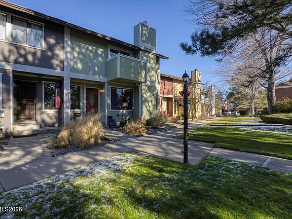 Welcome home to this well-appointed townhome in highly desirable Southwest Reno. This 3-bedroom, 2.5-bath residence offers 1,803 square feet of thoughtfully designed living space, featuring a beautifully updated kitchen ideal for everyday living and entertaining. The dining area flows seamlessly into the living room, where an updated gas fireplace adds warmth and charm. A convenient half bath is located on the main level. Upstairs, the primary suite features a private balcony, a spacious walk-in closet, and an ensuite bathroom with double sinks and a shower stall accented by a skylight. Two additional bedrooms and a full bathroom complete the second floor. Real hardwood flooring runs throughout the kitchen, dining area, and upstairs landing. Step outside to the back patio with durable Trex decking—perfect for hosting gatherings or relaxing outdoors. The gated community offers a shared pool, beautifully landscaped grounds, and mature trees, all within walking distance to Idlewild Park, home to weekly farmers markets and a variety of community events held throughout the year.