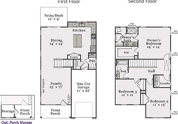 The Winslow 3 bedroom, 2.5 bath floor plan is intelligently designed with an open living layout. As you enter the home from the covered front porch, you experience the substantial family room with optional fireplace, large open dining area and thoughtfully laid-out kitchen with plenty of cabinet space and sizable chef's island. The powder room and coat closet at the garage entrance finish off the first floor. The owner's suite and two additional bedrooms are easily accessed from the spacious open hall at the top of the stairs. The owner's suite features a generous bathroom with dual-sink vanity, shower, and separate water closet as well as a spacious walk-in closet. The laundry room is conveniently located for easy access to bedrooms and guest bath. Options include additional windows on the second floor as well as converting the rear patio/deck into a covered or screened porch and an extended patio/deck option for even more outdoor living space. There is also a storage room option with window off the front porch for even more storage space. Elevation B boasts horizontal siding, a louvered gable vent, brick on the front garage wall and covered front porch for a beautiful traditional look.