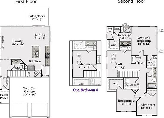 The Alexander features an open-living layout including a versatile kitchen with substantial chef's island, open dining area, grand family room and powder room. The ample two-car garage has separate doors for each bay. The second floor opens up to a roomy loft area with private owner's suite on one end and two additional bedrooms, guest bath and laundry room on the other. The owner's suite features a sizable bathroom with dual-sink vanity, shower, and separate water closet as well as a spacious walk-in closet that will fit both his and hers wardrobes. Options include converting the loft into a fourth bedroom, a deluxe bath with separate shower and tub in the owner's bath and additional windows in the owner's bedroom and bath. The rear patio/deck can be converted into a covered or screened porch and there is also an extended patio/deck option that doubles the square footage of the rear patio/deck. Elevation B boasts horizontal siding, louvered gable vents, and brick on the front garage wall for a more traditional look.