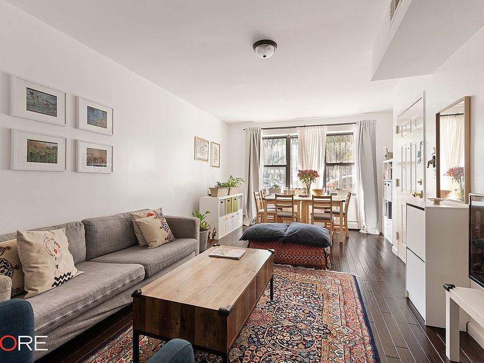 A townhouse style, ground floor two-bedroom in Crown Heights! Apartment 1 at 1497 Prospect Place is a full floor, two-bedroom, one-bathroom condo with an additional 305-square-foot lower level recreation room that could be combined with the upstairs to create a gracious garden duplex apartment! Enter the ground floor right into the open floorplan with nine-foot high ceilings. An 11' x 20' living and dining room features scraped hardwood floors throughout, and a large six-foot window looking out on the quiet residential tree-lined street. The kitchen has granite countertops, with all stainless steel Frigidaire appliances, and plenty of storage. The back two bedrooms are separated from the living space. The master is 9' x 18' feet, with a wall of closets, and a double window overlooking the common backyard of the condo. The second smaller bedroom is 9' x 13'. The bathroom has all white porcelain fixtures, and subtle grey porcelain tiled walls. Downstairs you have an additional 305-square-foot recreation room with windows out to the backyard. There is plumbing downstairs already in place, with a washer/dryer set up, and can legally add a half bath. The Pro Mark Condominium is a 36-unit townhouse style new development built in 2012. The building has an awesome 25 year tax abatement until 2036, making this an affordable investment, plus low monthly common charges. Each of the twelve buildings has just three apartments. The complex has one large shared common backyard space great for entertaining! Located just seven blocks from the 2/4/5 Utica subway, or eight blocks from the Utica A/C subway station, this condo is easily accessible.