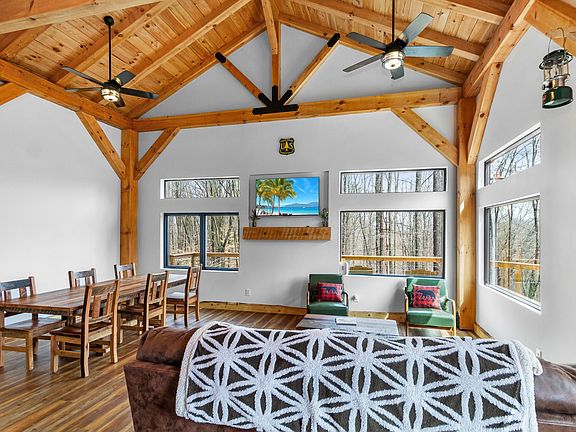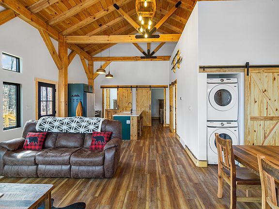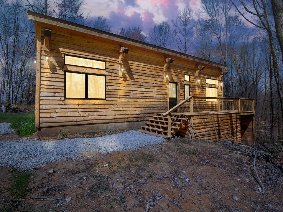Stunning! Newly constructed log cabin 2 beds + loft (sleeps up to 6) situated on over 5 acres of woods with stream! Full of natural light, cathedral ceilings, and gleaming hardwood flooring throughout! Sleek kitchen with copper fixtures, shaker cabinets, quartz counters, and upgraded appliances complete with eat-in island! Back deck overlooks your woods and steps lead down to another seating area tucked under the main deck and patio with firepit! Transom windows everywhere! Stackable washer/dryer with tankless water heater! Clean lines, well-appointed finishes, and a fantastic location off the beaten path but nearby endless options for entertainment, food, and shopping are endless while keeping the peace & quiet at home!
