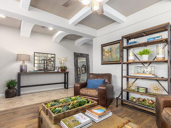 Stunning Home in the desirable Community of Rancho Gabriela. Highly upgraded w/grid ceiling in formal living room, ceiling fans, upgraded lighting, window blinds, & patio access from family room. Gorgeous chef's eat-in kitchen features center island, quartz counters, SS appliances, pendant lighting, pantry, & plethora of cabinetry. Perfect Home for entertaining inside & out. Private den w/coffered ceiling, amazing loft area, & 4 generous sized bedrooms. Upscale baths w/under-mount sinks, designer tile, & fixtures. Serene backyard setting! Covered patio, desert landscape, & endless blue skies. Near Shopping, Dining, & more. Pristine & move-in ready Home! With full price offer sellers will pay $2700 at closing towards exterior paint.