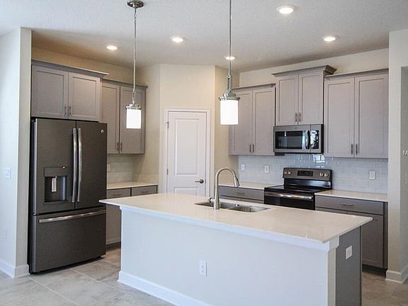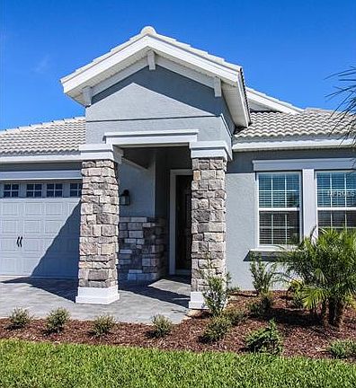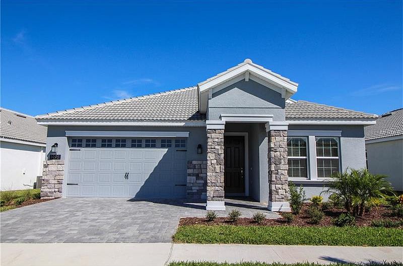 Under construction. Don't miss your chance to see this bright and spacious one story home. This home includes upgraded window sills, wood blinds, designer lighting and plush, wall-to-wall carpeting in all 3 of the roomy bedrooms. The master suite includes an oversized bathroom, his and her sinks, a large garden tub with a separate stand up shower. Both bathrooms have elegant flat panel maple wood cabinets with brushed nickel plumbing fixtures and designer wall tiles. You will find beautiful porcelain tile floors in the open concept kitchen, living room and dining room combination. The luxury kitchen features include a stainless steel under-mount sink, designer faucet, and granite counter tops. It also includes a stainless steel microwave, oven and refrigerator. This home also is equipped with ecosmart energy saving features like double-pane windows, GreenGaurd Max house wrap and energy star rated appliances. Come enjoy this gated community's spectacular amenities including the pool, tennis court, fitness center, business center, lazy river, movie theater and even a Tiki bar! This home is in a great area with easy access to I4 and just a short drive away from some of Florida's well known theme parks.