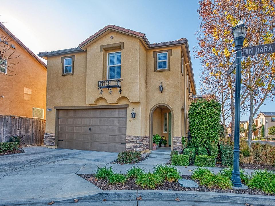 This charming Wilson built home is in pristine condition located on a premium corner lot within the highly desirable Harlan Ranch community of Clovis & features an energy efficient Solar Power System. As you enter you'll notice the beautiful upgraded hardwood flooring downstairs, impressive interior decor, plantation shutters throughout entire home & wide crown molding trim. The comfortable LR offers a cozy ambiance with lots of natural light. An open concept kitchen features granite counters, a peninsula island with breakfast bar, panty & bright dining area with designer pendant lighting. Completing the downstairs is a 1/2 BA with updated vanity cabinet. Other recent updates include newer carpet upstairs, nice tile floors in BA's & laundry room, high quality light fixtures & interior paint. The spacious MBR suite offers designer wallpaper accent & crown molding trim & MBA features updated granite counter, antique finished vanity cabinet & large walk-in closet with built-in dresser. Both the spare BR's are nicely sized as well & the hall BA features a sliding barn door hallway entrance. Also upstairs is a custom built-in computer/work desk area. Get ready to relax on the back patio with its custom concrete bench seating, built-in BBQ island, soothing water fountain & extra privacy with no neighbor to the north. Enjoy the HR benefits of the clubhouse, Olympic sized pool, parks, playgrounds, walking trails, year-round community events, patrolled security & landscape maintenance