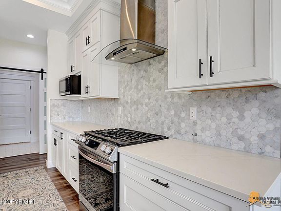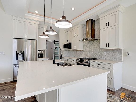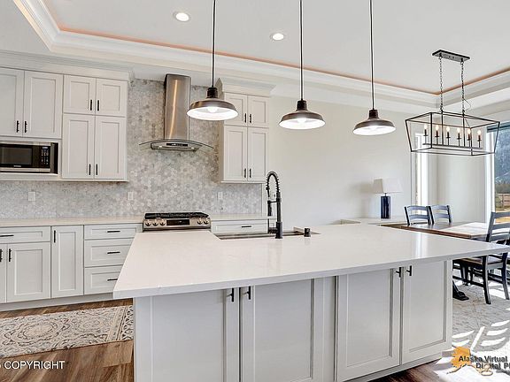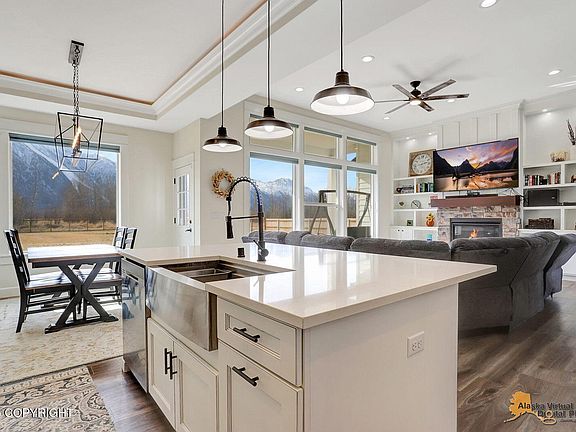 Stunning Ranch home in Colonial Fields with soaring 11' ceilings, oversized windows, and an open-concept great room that perfectly frames mountain views. The built-ins and cozy fireplace create a space that feels both elegant and inviting. Kitchen features quartz countertops, stainless steel appliances, and walk in pantry. Primary suite is tucked away for privacy and has a spa like features.Colonial Fields is surrounded by Alaska's natural beauty, nestled between The Butte, Knik River, and Matanuska River. This home backs to a state-owned conservation tract for endless scenery. A home that blends modern luxury with the best of Alaska's great outdoor schedule your private tour today!