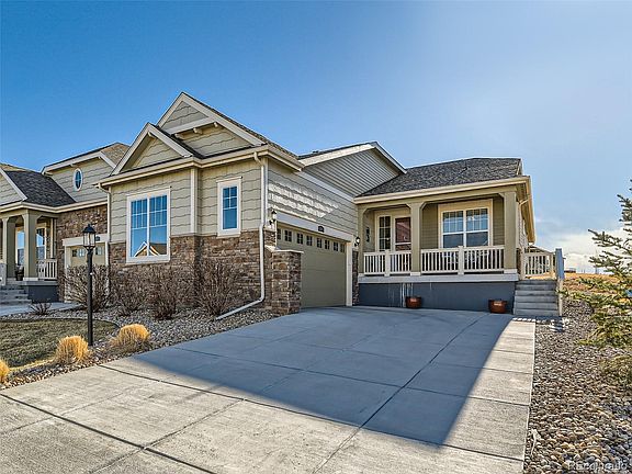 Welcome to your new home in the sought-after 55+ gated community of Heritage at Todd Creek! This ranch-style residence features 2 bedrooms and 2 bathrooms, 1,659 finished square feet, 3,317 total square feet and an attached 2-car garage. Inside, you'll find wood flooring throughout most of the main floor, creating a warm and inviting atmosphere. The large, gourmet kitchen is equipped with granite counters, large center island, and stainless-steel appliances, including a gas stove and double oven – perfect for daily cooking and entertaining. The living room includes a gas fireplace, large windows, and tons of natural light providing a cozy focal point for relaxation. Step outside onto the covered deck to enjoy the open space behind and impressive mountain views. Enjoy the fantastic amenities of this golf course community that include a clubhouse, fitness center, pool, social activities, restaurant, hot tub, and tennis courts.