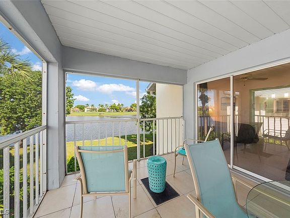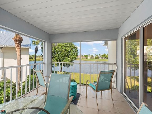 SUNLIGHT POURS IN OFF THE GLISTENING LAKE. Second floor end unit with windows seemingly everywhere. Located in the Rivers Edge Community of prestigious Gulf Harbour Golf and Country Club in Southwest Ft. Myers. The living room, kitchen and primary bedroom are wrapped around the huge screened lanai with the sliding doors forming a corner of glass that allows the spectacular water view to sparkle through virtually the entire unit. Vaulted ceilings increase the open feeling. Laminate flooring thru the living area with Berber carpet in the bedrooms. Updated kitchen with granite countertops and lazy Susan lower units. Primary bedroom accommodates a king bed plus supporting furnishings. Large walk-in closets. Updated bath. Large closets in both guest bedrooms, one with a conventional bedroom set and the other with bunk beds and pull-out trundle. Stacked washer and dryer with utility closet adjacent to bedrooms. Updated guest bath. Dining area overlooks water view. Covered reserved parking. Guest parking nearby. Just a few steps to the community pool and spa. Sold completely turnkey with classic comfortable furnishings so it is move-in ready, either as a winter hideaway or great seasonal rental. Miles of pathways inside the gate to enjoy bike rides, jogging, or casual walks in the sunshine. Close to Ft. Myers Beach, Sanibel Beach and nearby Bunche Beach. Or simply stroll the private Gulf Harbour Eagle Perch Island for gorgeous sunsets. Surrounded by shopping and restaurants. Easy access to SWFL International Airport, plus Twins and Red Sox baseball stadiums. Additional amenities of golf, tennis, fitness center and two restaurants require an optional membership, now available at a surprisingly low fee.