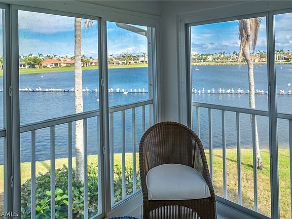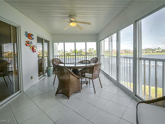 BEAUTIFULLY REDONE WITH MESMERIZING VIEWS. Light flows thru this stunning 2nd floor 3BR/2Ba corner unit like a breeze, carrying refreshing water and golf course visuals. Located on a quiet cul-de-sac in the Rivers Edge community, deep inside gated Gulf Harbour in SW Ft. Myers. No McGregor noise. Watch colorful water birds from your enclosed tiled oversized lanai, featuring acrylic sliders with 8 times the insulating value of glass. Leave interior doors open and enjoy comfort, regardless if it's hot or cool outside. Fully updated, unit has bamboo and tile floors w/quartz kitchen counter tops. Beautiful backsplash. High end appliances. Both bathrooms redone. Living room, dining area, kitchen and primary bedroom have vaulted ceilings. Reserved space in covered carport is right outside the door. Just a few steps to community pool and mailboxes. Bike or walk to our private island on Caloosahatchee River. Surrounded by restaurants, grocery outlets and services. Optional membership includes amenities like golf, tennis, fitness center, large pool and 2 restaurants. Marina w/192 slips. Public golf, pickleball and tennis nearby. Low condo fees include cable TV
