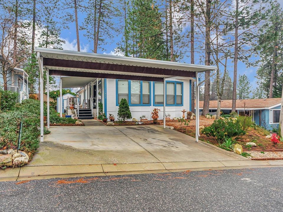 Ponderosa Pines is a BEAUTIFUL senior community of manufactured homes. Located right off of highway 49. This home offers two bedrooms and two full baths with a Large Family Room combined with a spacious dining area with Built-in. Main bedroom is huge! Kitchen is roomy with plenty of room for you cooks! Newer HVAC in 2021. The park is 40 acres and located between Auburn and Grass Valley and surrounded by Tall Pines shared with Deer, Turkey and other Wildlife. Home has a shed for storage. Park offers a clubhouse and POOL! This DARLING home needs a little love BUT with new carpet could be move in ready! There are park shares available for purchase to reduce your monthly space rent down to approximately $200!